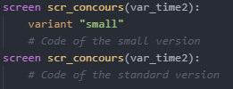 Several variant can be used at once. For instance, if a player uses a small touchscreen then renpy.variant("small") and renpy.variant("touch") both return True.