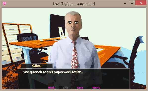 Add to that a few multi-screen minigames, screens that don't count as minigames (point and click intermissions), a gallery (not using Ren'Py built-in system... it was added right after we were done I guess), an agenda, several office software simulators, a website displayed on a phone (which will sonn become a phone in a phone) etc. etc. etc. Overall, a motley collection of 113 screens with varying gameplay, layout and engin proficency from the developpers during the years of development.