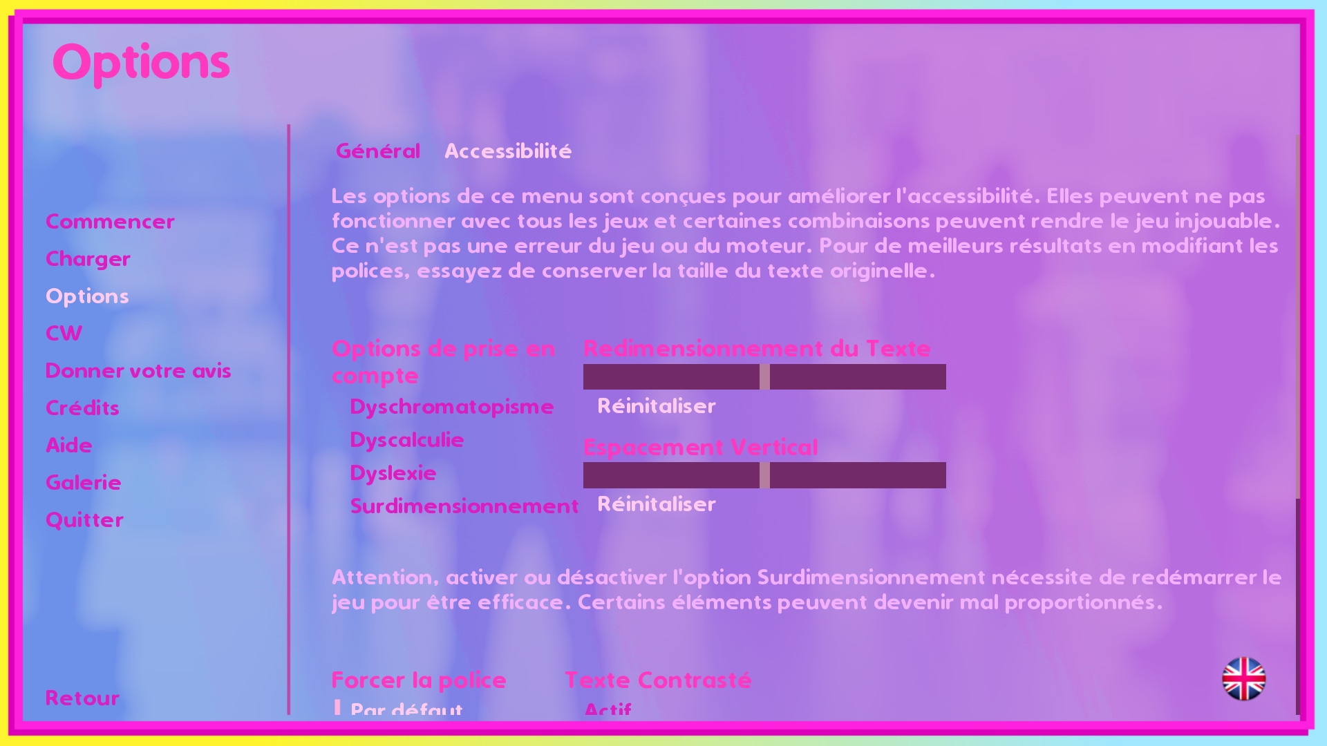 Ce patch met également en place des options additionnelles d'accessibilité, regroupées dans un menu (avec les options natives de Ren'Py) : meilleure prise en compte de la dyschromatopie, de la dyscalculie et de la dyslexie ; possibilité de surdimensionner le jeu pour une meilleure lisibilité et un peu plus de voice reading.