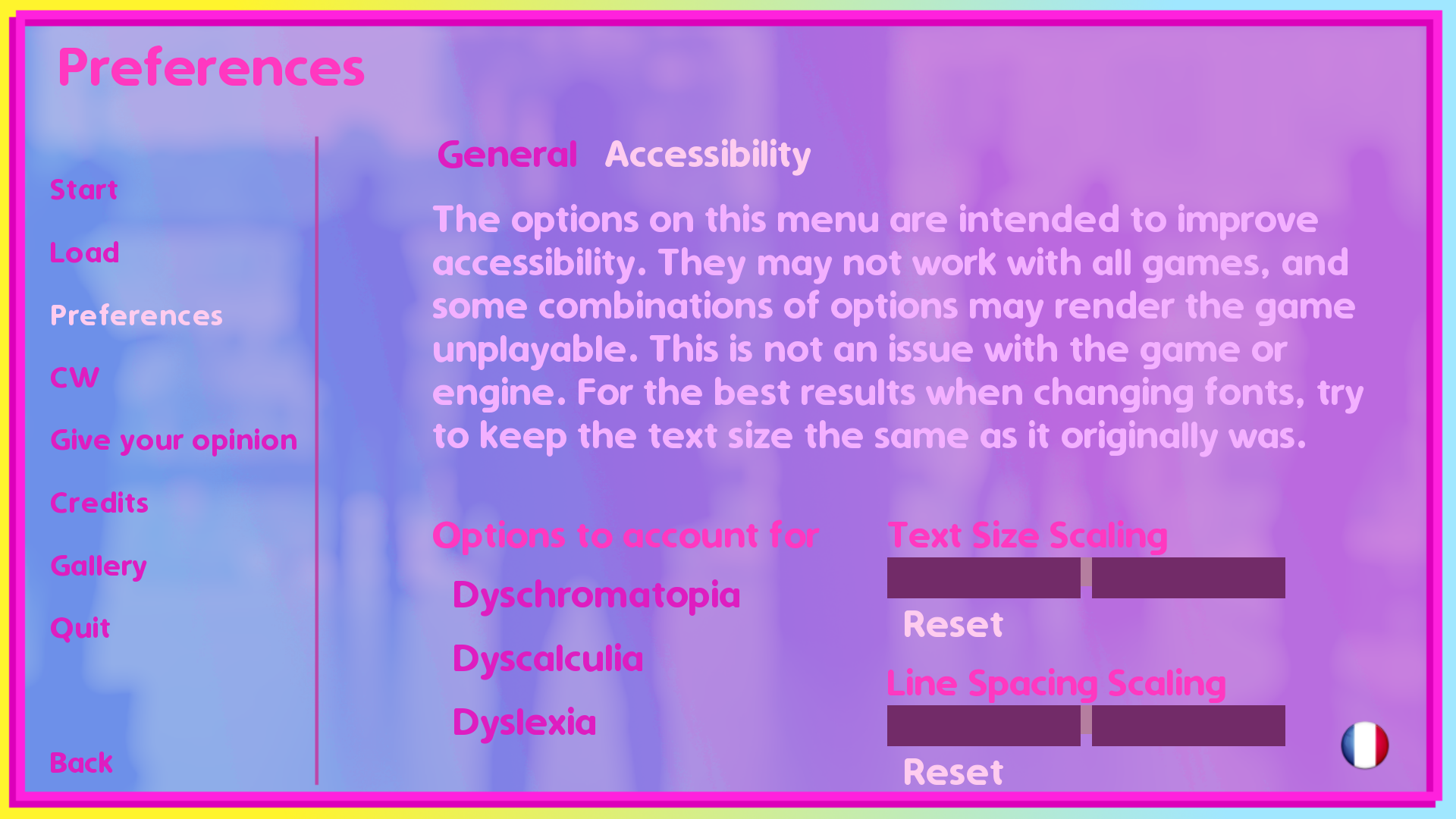 This patch also adds several accessibility features in a dedicated menu: better account for dyschromatopia, dyscalculia and dyslexia ; an option to oversize the game for better legibility and a little more voice reading.